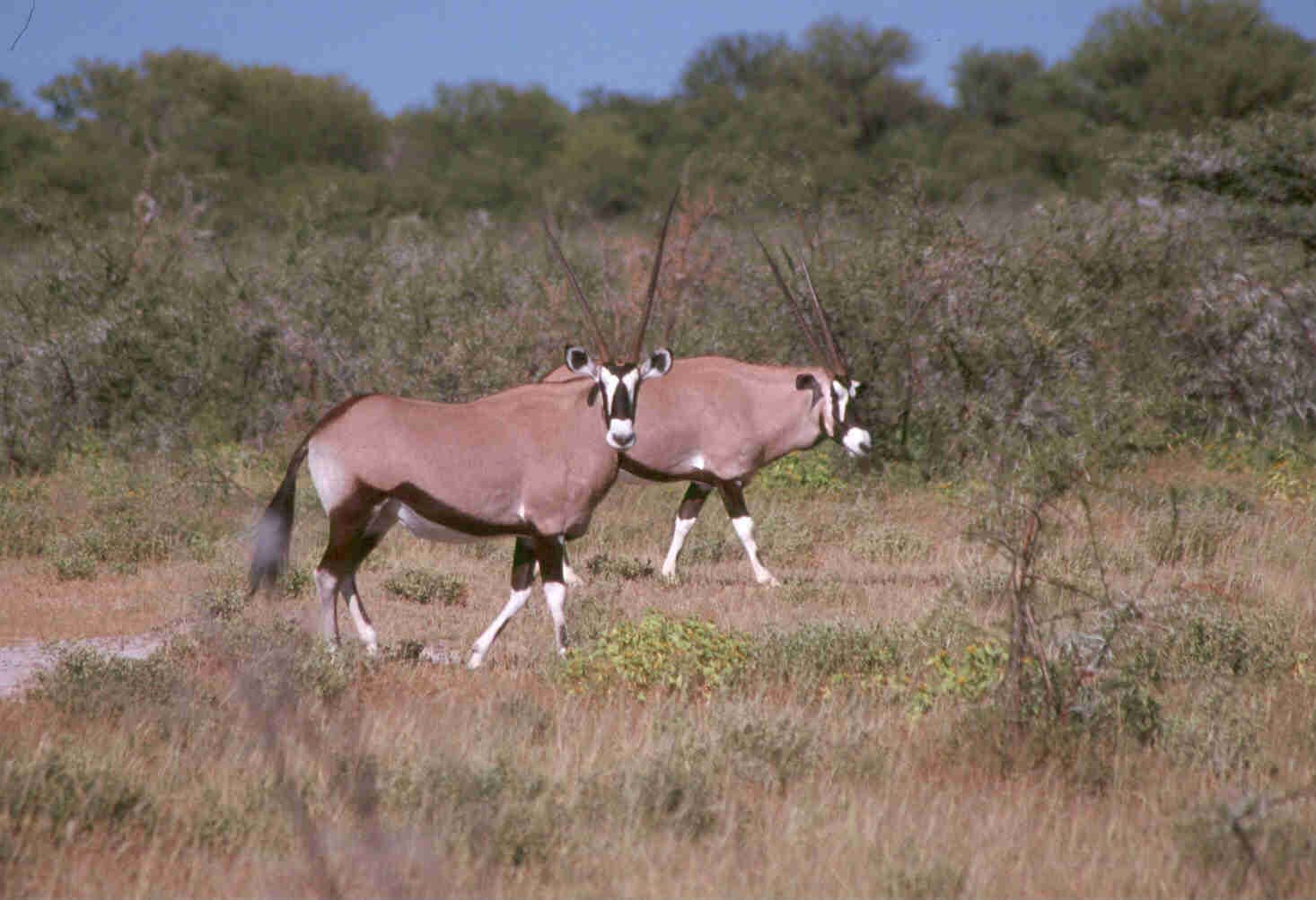These large African antelopes prefer dry, near-desert conditions and can survive without water for long periods. The smallest species, the Arabian oryx, is now almost extinct, and another, the scimitar-horned oryx of the Sahara is on the endangered list. Oryxes live in herds of up to 60 animals. Newborn calves are able to run with the herd immediately after birth. Both males and females possess permanent, narrow, straight horns. The female's are slightly longer and slimmer than the male's. These horns are quite lethal, and the oryx has been known to kill lions with them. They are also the reason this animal is sometimes called the sabre antelope.