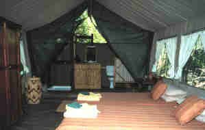 Xigera Camp (pronounced Kee-je-ra) is located on Paradise Island, in Botswana’s Moremi Game Reserve, adjoining the Okavango Delta. Xigera Camp can accommodate 16 guests in comfortable tents with en suite bathrooms. Xigera Camp’s tents are built on elevated decks and face an Okavango Delta river that flows by the Xigera Camp. This Okavango Delta river with its clean waters is Xigera Camp’s natural “swimming pool”. Meals and drinks at Xigera Camp are served in a thatched building with good views of the footbridge that lions and leopards use to go across neighbouring islands of the Okavango Delta. Many Xigera Camp guests have seen these predators make the crossing from the dining area.